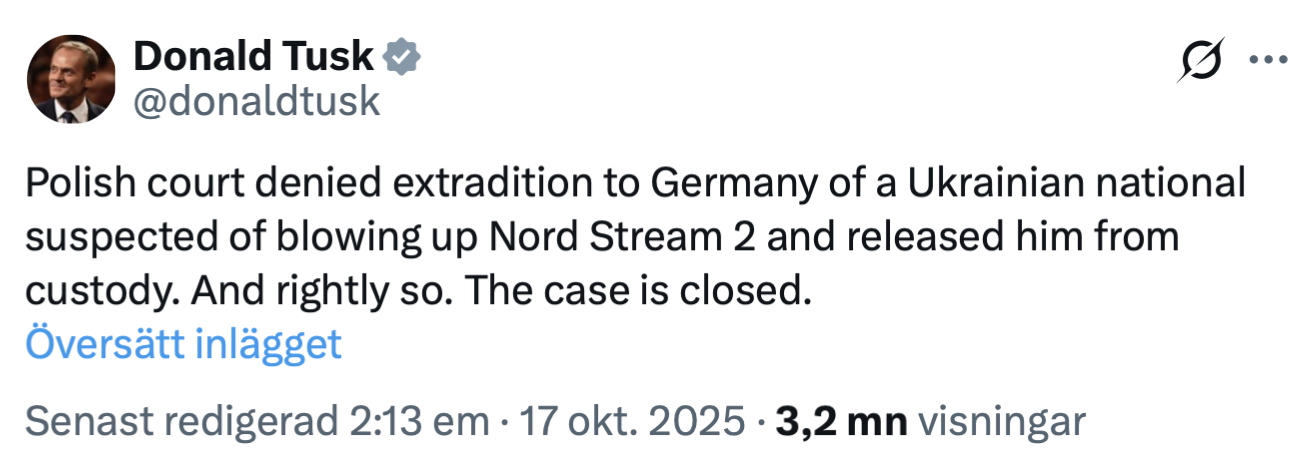 På sociala medier skriver den EU-vänlige premiärministern att domstolens beslut ”är helt rätt” och att ”fallet är avslutat”. Uttalandet kan uppfattas som ett tecken på att han inte prioriterar att driva en utredning mot den aktion som vissa betraktar som ett terrordåd mot EU:s energiinfrastruktur.