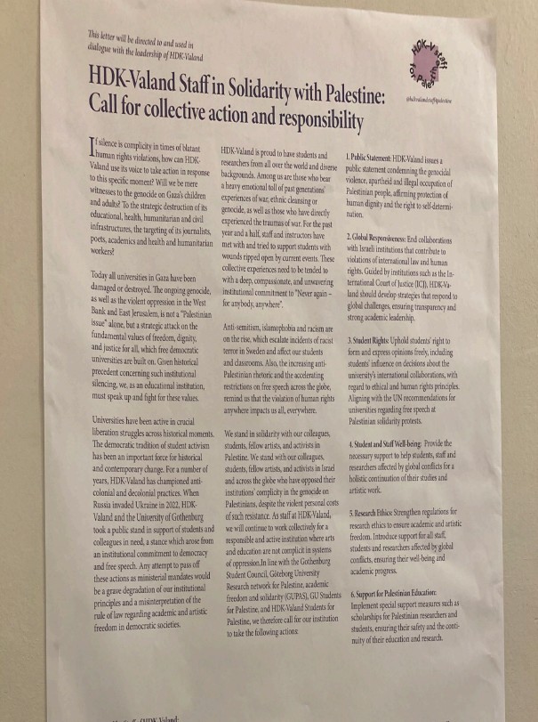 Det var i mars i fjol som HDK-Valand, en institution inom Göteborgs universitet, togs över av de palestinaaktivister som tidigare ockuperat Vasaparken. Där framförde man budskap som att Israel inte existerar, att ”palestinska krigare” deltog i massakern den 7 oktober 2023 oktober och att universitetet är medskyldigt till folkmord. ”Kristerssons rasism dödar”, stod det på en av skyltarna.