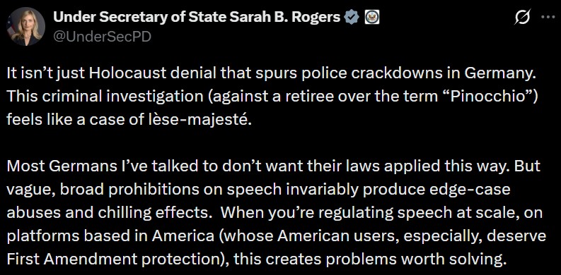 ”Det är inte bara förnekelsen av Förintelsen som driver på polisens tillslag i Tyskland. Den här brottsutredningen känns som ett fall av majestätsbrott [förolämpning av monarken i äldre rätt]”, skriver Rogers i ett X-inlägg och tillägger att de flesta tyskar hon pratat med inte vill att deras lagar ska tillämpas på det här sättet. Hon noterar också att inskränkningen av yttrandefriheten görs på amerikanska plattformar:
