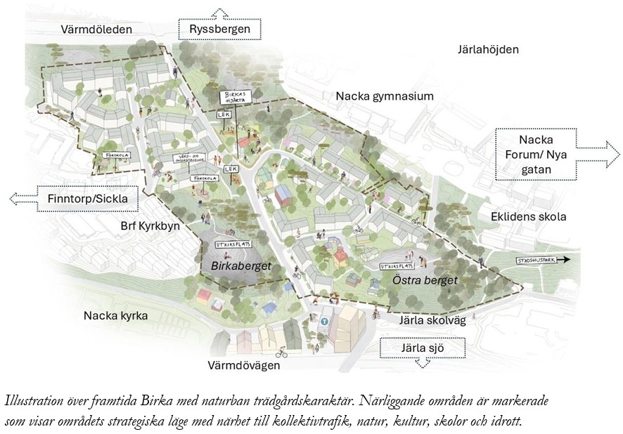 Birka är ett av Nackas äldsta villasamhällen från förra sekelskiftet och hotas nu av exploatering. Projektet innebär en allvarlig påverkan på både natur- och kulturmiljöer, särskilt i relation till områdets topografi och de värdefulla kulturhistoriska byggnaderna som riskerar att påverkas negativt. Trots intentionerna att integrera dessa värden i den nya bebyggelsen är exploateringens omfattning alldeles för hög och kommer att förstöra områdets särpräglade karaktär. Det är Nackalistans ståndpunkt om planerna som partiet hållit fast vid sedan 2024.