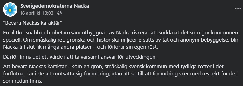 – Det här är en unik situation där ett område får helt andra förutsättningar med tunnelbaneuppgång i området och hög exploateringsgrad i direkta närområdet. Hade det varit vilket annat villaområde i Nacka som helst, skulle det inte vara aktuellt att diskutera den här typen av omvandling, sa Disa Påhlman Nilsson (M).