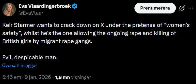 I inlägget ifrågasätter hon Starmers hot om att blockera X med hänvisning till ”kvinnors säkerhet” medan brittiska kvinnor och flickor fortsätter att utsättas för sexuella övergrepp av migrantgäng: