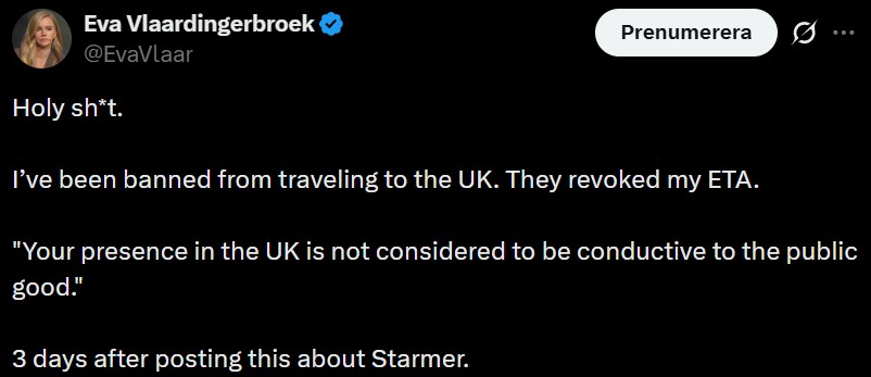 Indragningen sker endast tre dagar efter att hon postat ett inlägg om premiärminister Keir Starmer som fått nästan två miljoner visningar – något hon misstänker kan ha något med inreseförbudet att göra.