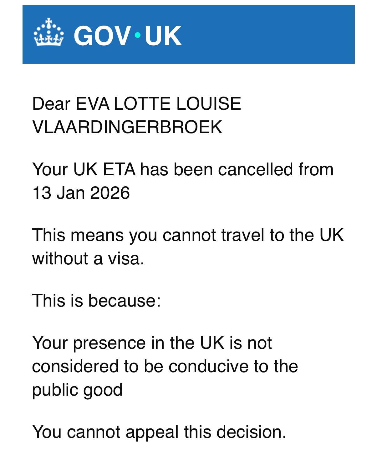 På onsdagen fick Vlaardingerbroek veta att hennes elektroniska resetillstånd (ETA) till Storbritannien har dragits in.