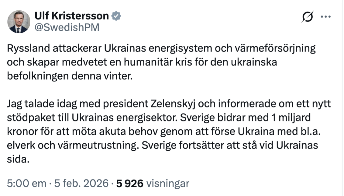Sverige ska skänka mer, meddelade statsministern på torsdagen, och därefter har ytterligare en miljard kronor skickats iväg. I ett inlägg på X skriver han att Sverige fortsätter att stå vid Ukrainas sida.