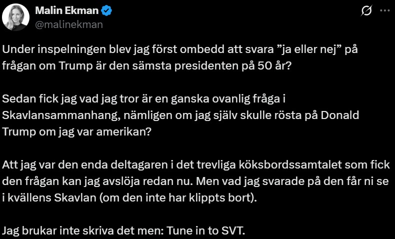 Med i programmet fanns även Malin Ekman, journalist som tidigare lämnat Svenska Dagbladet då hon ansåg att tidningen blivit för ängsliga och ensidiga i sin bevakning och att svenska medier generellt inte är tillräckligt nyanserade – exempelvis i bevakningen av USA.