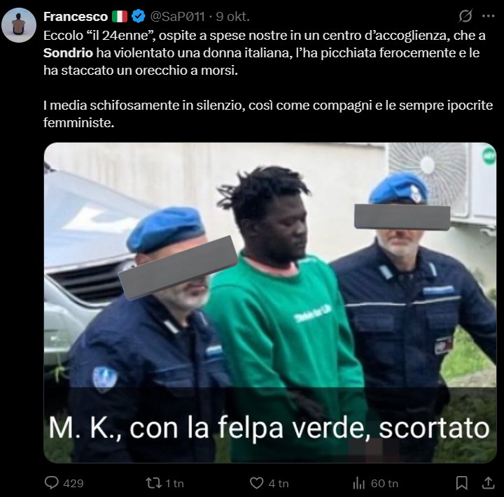 Enligt Remix News har afrikanen åtalats för våldtäkt, sexuellt övergrepp, rån och kroppsskada och tilldelades en tolk. Den misstänkte är född 2001, har initialerna KM och kommer ursprungligen från det afrikanska landet Mali. Han bor för närvarande på flyktingmottagningen Valle di Colorina som drivs av en icke-statlig organisation som välkomnar flyktingar.