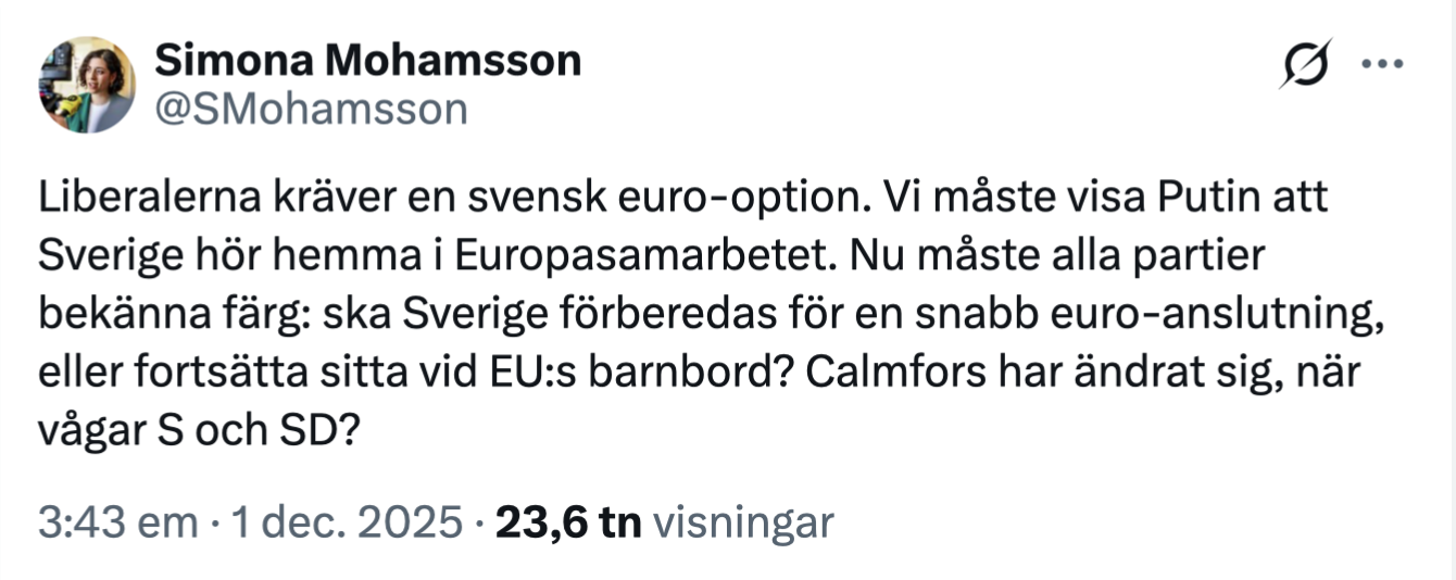 Eurofrågan fick ny fart efter ett utspel från Liberalernas partiledare Simona Mohamsson. I ett inlägg på X krävde hon en snabb svensk euro-anslutning och argumenterade för att valutabyte skulle vara ett sätt att markera mot Ryssland.
