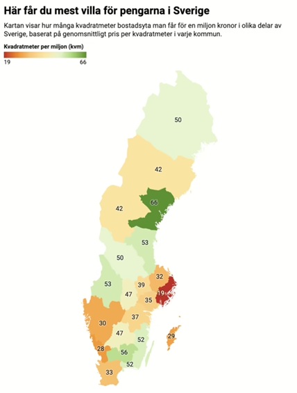 Siffrorna visar att mest kvadratmeter per miljon får man i Västernorrland (66) följt av Kronoberg (56), Gävleborg (53) och Värmland (53).