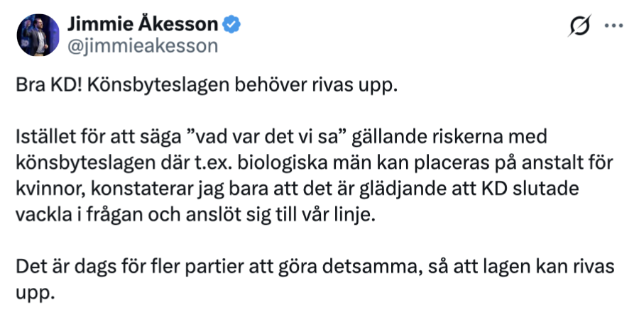 Den nya könstillhörighetslagen, som röstades igenom 2024 och trädde i kraft den 1 juli i år, har gjort det enklare att ändra juridiskt kön. Kravet på könsdysforidiagnos togs bort och åldersgränsen sänktes till 16 år. Moderaterna var ett av partierna som drev igenom lagen, trots interna motsättningar körde partiledare Ulf Kristersson över kritiken.