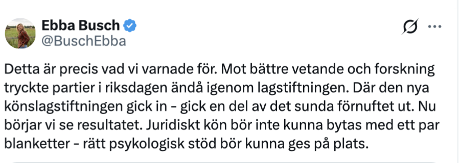 ”Där den nya könstillhörighetslagen gick in – gick en del av det sunda förnuftet ut. Nu börjar vi se resultatet”, skrev Busch bland annat.