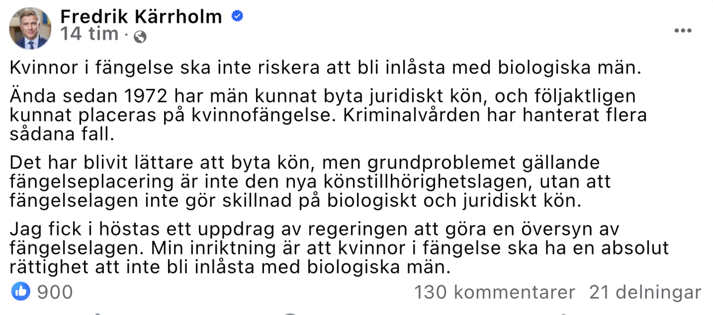 Placeringen av intagna inom Kriminalvården bör grundas på biologiskt kön i stället för juridiskt. Det anser den moderate riksdagsledamoten och tidigare polisen Fredrik Kärrholm, som nu vill se en ändring i fängelselagen. Bakgrunden är beslutet att flytta den livstidsdömde egyptiske transan Paulus Abdelshahed till en kvinnoanstalt efter att han bytt juridiskt kön hos Skatteverket. Däremot är varken någon ändring av eller ett rivande av könsbyteslagen aktuellt. I stället riktar Kärrholm kritik mot KD och SD, som han menar ”gör billiga politiska poänger”.