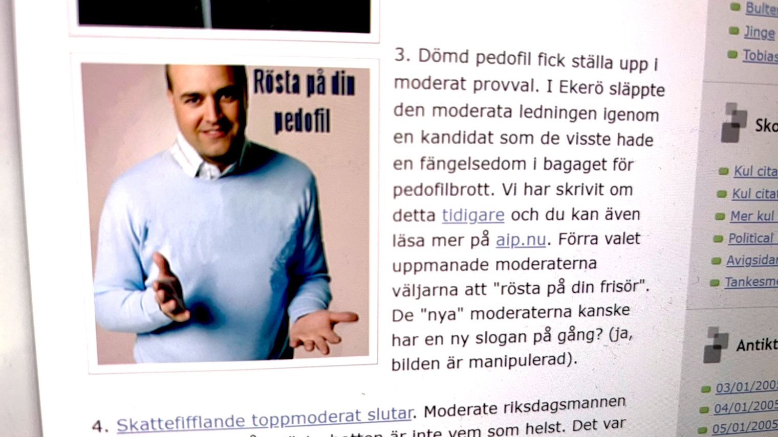 För 20 år sedan, i december 2005, laddades en bild på dåvarande moderate partiledaren Fredrik Reinfeldt upp till en blogg på Blogspot som kallades för ”Rättvis och balanserad”. Bilden försågs med texten ”Rösta på din pedofil”.