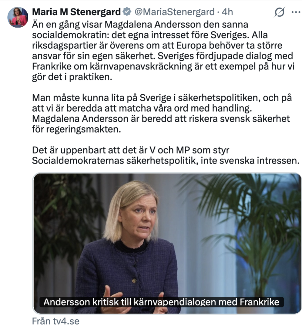 I ett inlägg på sociala medier riktar utrikesminister Maria Malmer Stenergard kritik mot att Magdalena Andersson inte vill förhandla med Frankrike om en kärnvapensköld. Hon menar att Socialdemokraterna därmed visar den ”sanna socialdemokratin: det egna intresset före Sveriges”.