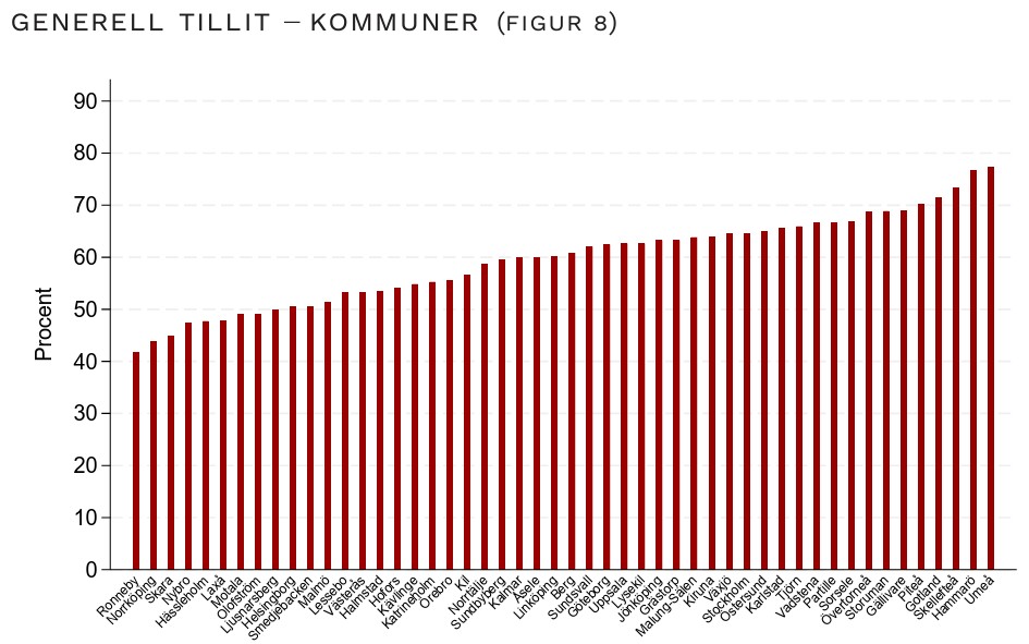 Högst tillit uppmättes i Umeå med 77 procent och lägst i Ronneby med 42 procent. Man noterar att flera av de kommuner som ligger lägst i den generella tilliten är orter som tidigare varit beroende av en stor industri som nu har avvecklats.