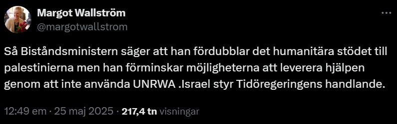 Nu är det Tidöregeringen och bistånds- och utrikeshandelsminister Benjamin Dousa (M) som Wallström riktat in sig på. I ett utspel på X beklagar hon sig över att Dousa sagt att man fördubblar det humanitära stödet till de palestinska områdena men ”förminskar möjligheterna att leverera hjälpen genom att inte använda UNRWA”. Detta menar Wallström i sin tur betyder att ”Israel styr Tidöregeringens handlande”.