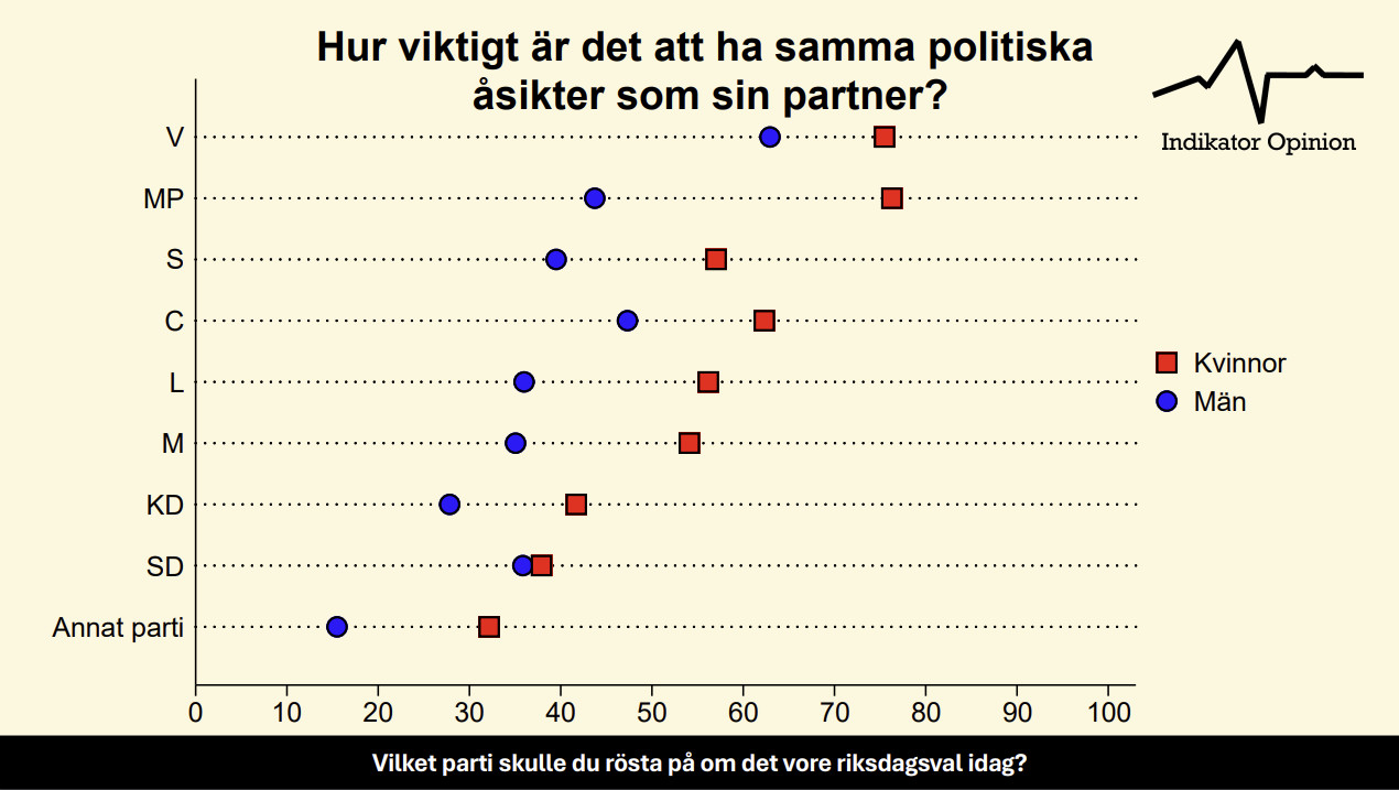 Indikator Opinion frågade under januari månad i år 6906 röstberättigade svenskar om de tycker att det är ”viktigt att ha liknande politiska åsikter som sin partner i en kärleksrelation”. Av dessa var det 2941 som svarade.
