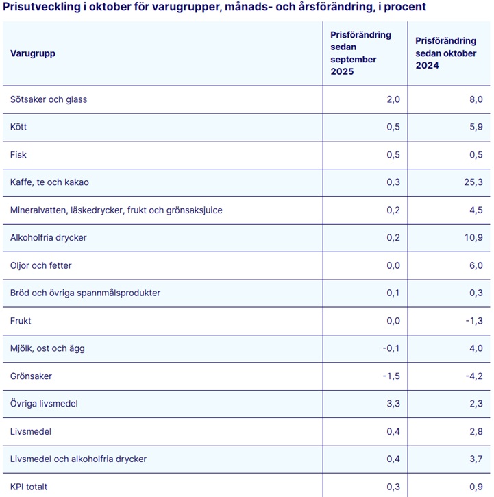 Även saker som mineralvatten, läsk och frukt- och grönsaksjuicer blev dyrare i oktober. På ett år har priset på kaffe stigit med omkring 30 procent. Under de senaste tolv månaderna har också choklad och djupfrysta bär och frukter gått upp rejält.