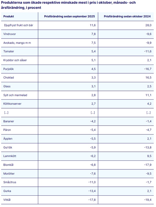 Det som blev billigare i oktober var framför allt grönsaker och frukt. Mest minskade priset på gurka och vitkål med en nedgång på 13 respektive 18 procent.
