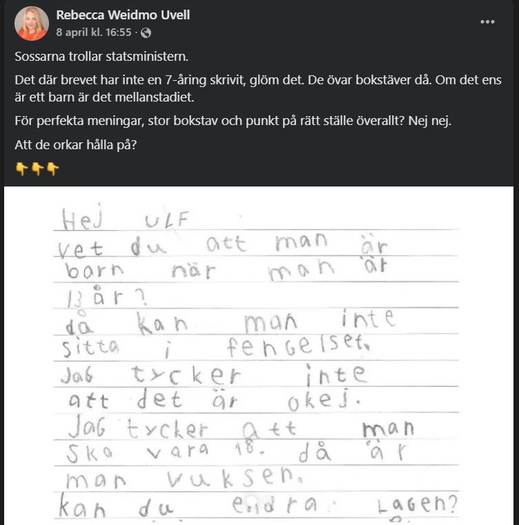 ”Hej Ulf, vet du om att man är barn när man är 13 år?”, inleds brevet med och författaren anser att först vid 18 års ålder borde fängelse bli aktuellt då man är vuxen.