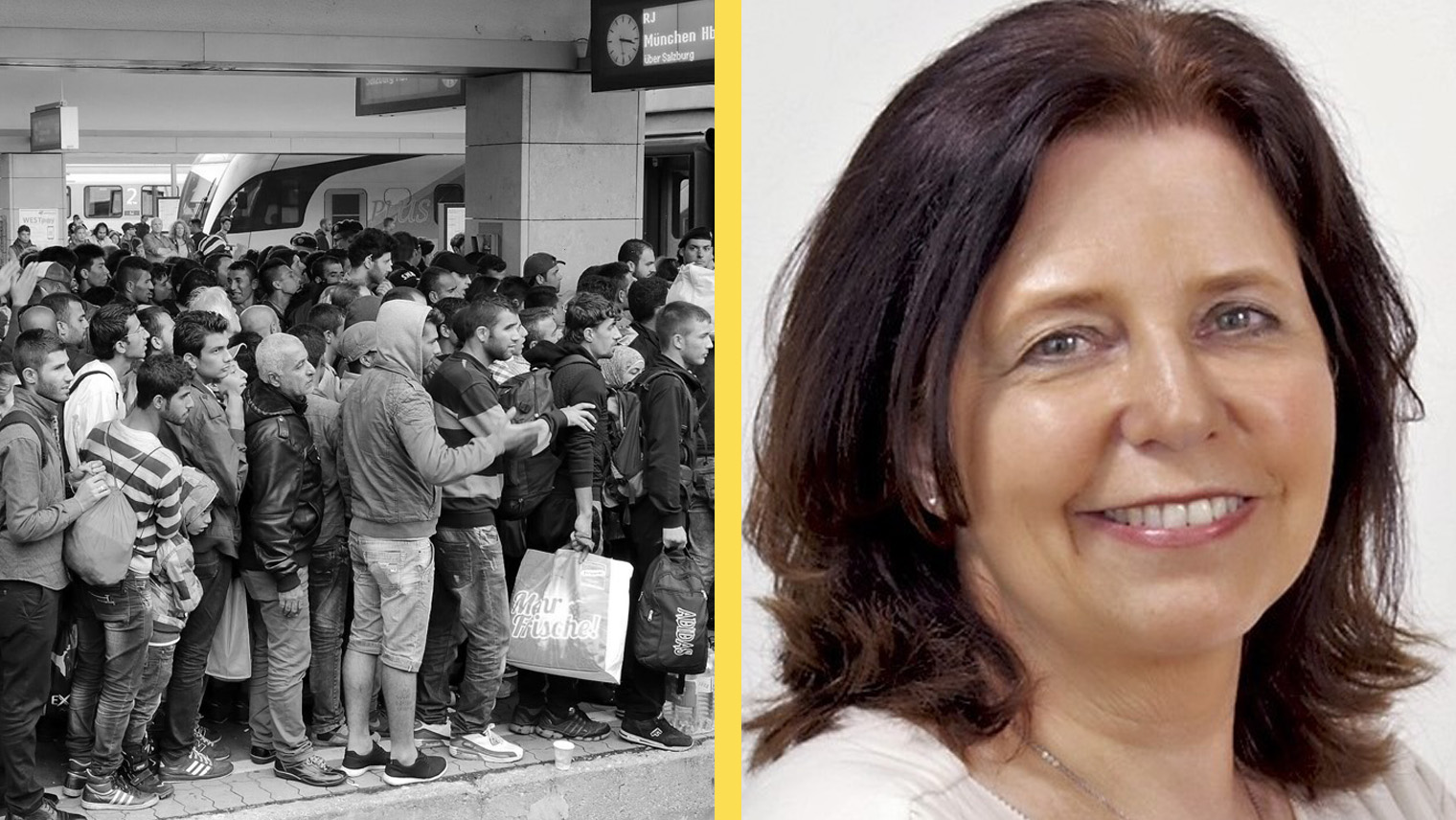 Genrebild Migranter, Migrationsverkets generaldirektör Maria Mindhammar. Foto: C.Stadler/Bwag. CC BY-SA 4.0 och Faksimil Facebook