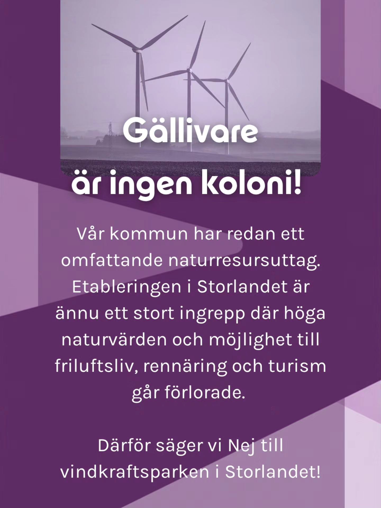 “Våra medlemmar har sagt sitt! Medlemmarna beslutade igår enhälligt att säga nej till ansökan om vindkraftsetablering i Storlandet.”