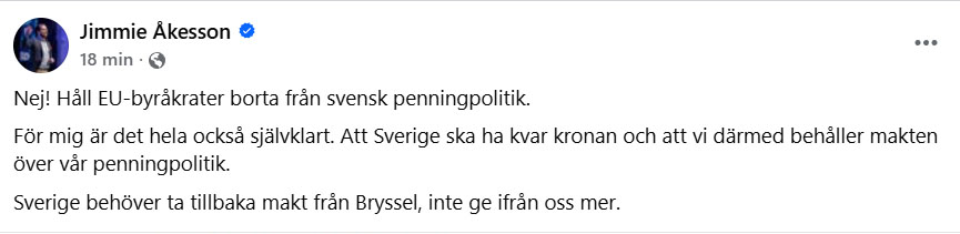 ”Nej! Håll EU-byråkrater borta från svensk penningpolitik. För mig är det hela också självklart. Att Sverige ska ha kvar kronan och att vi därmed behåller makten över vår penningpolitik. Sverige behöver ta tillbaka makt från Bryssel, inte ge ifrån oss mer”, skriver Åkesson på Facebook.