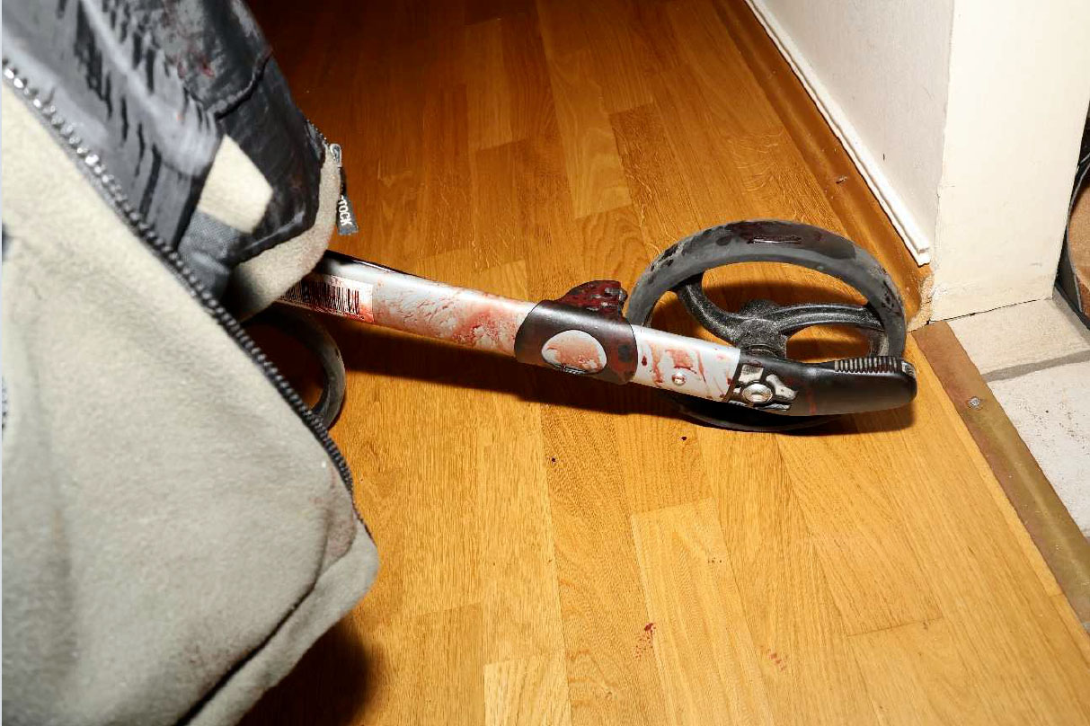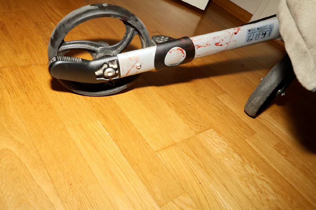 I hallen stod den rullator som mannen använde till vardags. På den nedre delen av rullatorn säkrades blodiga kontaktspår. Enligt kriminalteknikerna talar detta för att mannen, redan svårt skadad och blödande, försökte flytta eller stödja sig på rullatorn under angreppet – ett tecken på ett desperat försök att ta sig undan eller hålla sig upprätt.