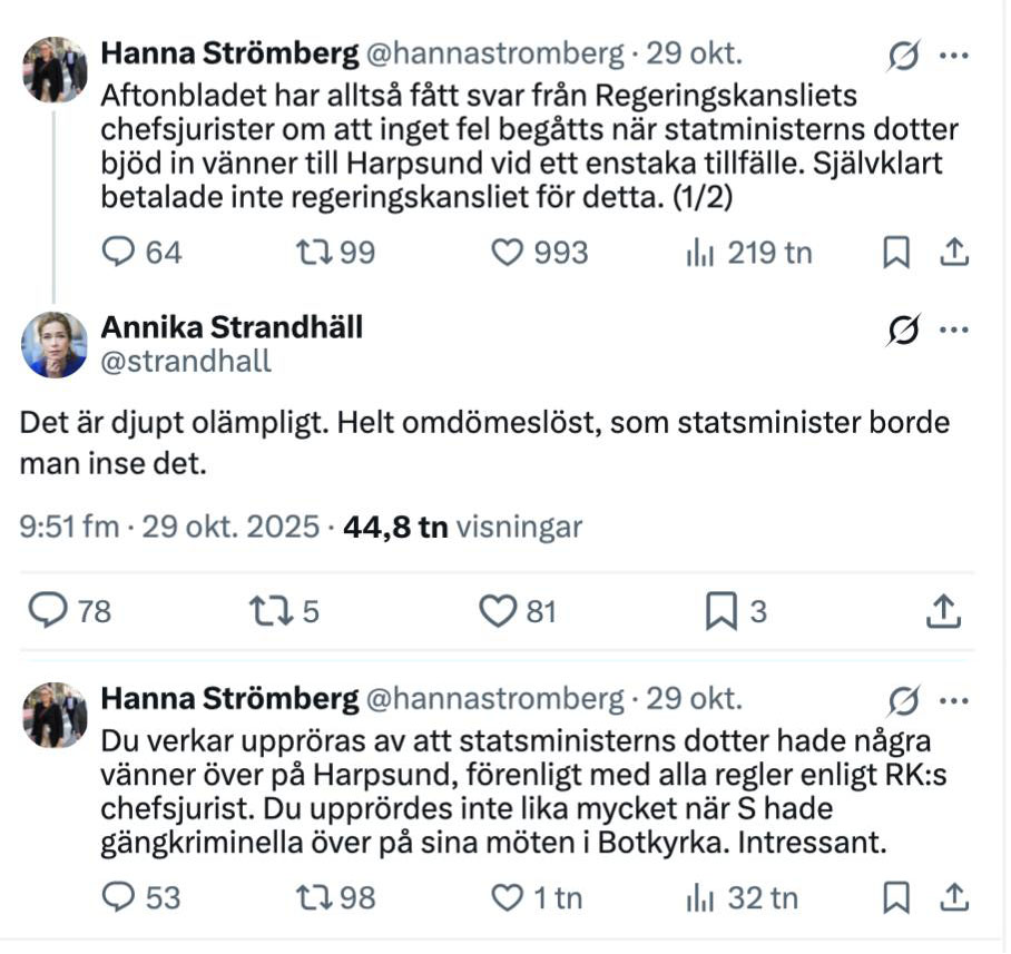Strömberg kontrar i ett svar med ”Du verkar uppröras av att statsministerns dotter hade några vänner över på Harpsund, förenligt med alla regler enligt RK:s chefsjurist. Du upprördes inte lika mycket när S hade gängkriminella över på sina möten i Botkyrka. Intressant.”