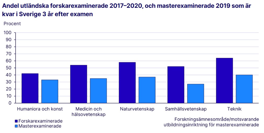 Bland de som tagit en masterexamen 2019 fanns endast var tredje kvar i landet tre år senare, och bland de med magisterexamen var det så få som 15 procent. Sammanlagt examineras omkring 1 000 utländska forskarstuderande varje år i Sverige. Ungefär 5 000 tar examen från ett 2-årigt masterprogram och ungefär 1 600 från ett 1-årigt magisterprogram.