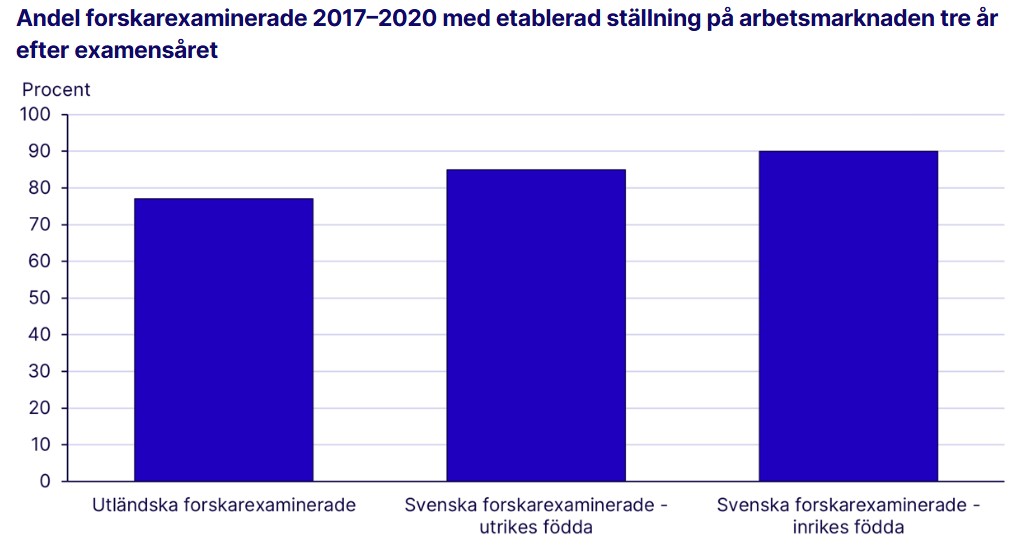 Utländska forskarexaminerade etablerar sig också i lägre utsträckning på svensk arbetsmarknad än svenska forskarexaminerade. Bland utländska forskarexaminerade som är kvar i landet är 77 procent etablerade på arbetsmarknaden medan motsvarande andel bland inrikes födda är 89 procent.