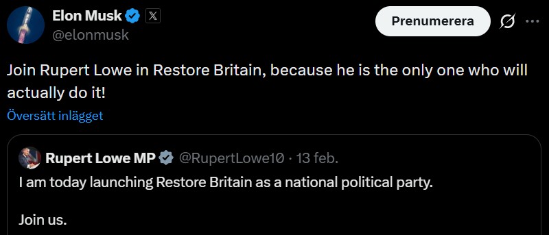 Rupert Lowes politiska karriär började i Tories och fortsatte sedan via Brexit Party till Reform UK. Efter flera kontroverser lämnade han i fjol Reform UK och började smida planer på ett eget parti – Restore Britain. Det nya partiet förespråkar utvisning av alla illegala invandrare i Storbritannien, skydda brittisk kultur och återställa landets kristna principer.