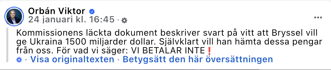 Nyligen uppgav Orbán att Ukraina väntas få cirka 8 450 miljarder kronor i finansiering under de kommande tio åren – en summa som enligt ungerska medier ska inkludera EU-medel, amerikanskt stöd och privata investeringar.