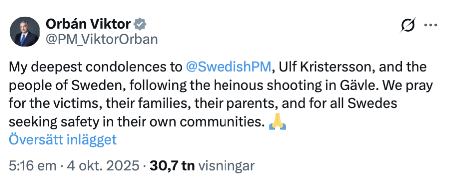 Ungerns premiärminister har kommenterat den gängrelaterade masskjutningen i Gävle natten mot lördag där en 13-årig pojke mejade ned sex personer. Viktor Orbán skriver att han ”ber för svenskarna som nu söker trygghet i sina samhällen”. En otrygghet som följt i massinvandringens spår.