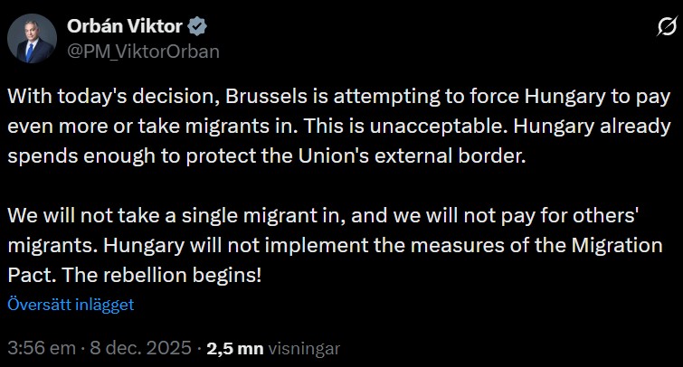 ”Vi kommer inte att ta emot en enda migrant, och vi kommer inte att betala för andras migranter. Ungern kommer inte att genomföra åtgärderna i migrationspakten. Upproret börjar!”