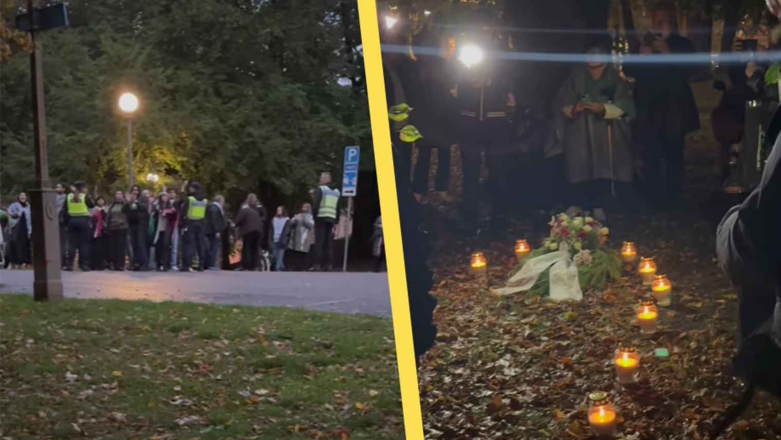 Under minnesstunden började de skandera “Death to the IDF”, “From the river to the sea” och ”Inga sionister på våra gator”, och medan ljusen fortfarande brann slog de till. Mobben sparkade sönder minnesplatsen, välte omkull gravljusen och rev bilderna på Hamas offer.