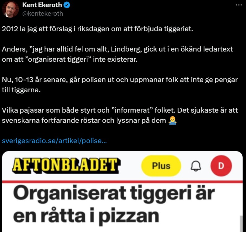 Traditionsenligt är Sverigedemokraterna först ute med ståndpunkter i frågor övriga sedan följer efter. Invandringen var en sådan fråga, det hitresta tiggeriet ett annat. Ett nationellt tiggeriförbud är också något som regeringen och Sverigedemokraterna ska titta närmare på. I september i fjol meddelade Tidöregeringen att en utredare ska lämna förslag på ett landsomfattande tiggeriförbud och ska redovisa sitt uppdrag senast den 26 juni i år.