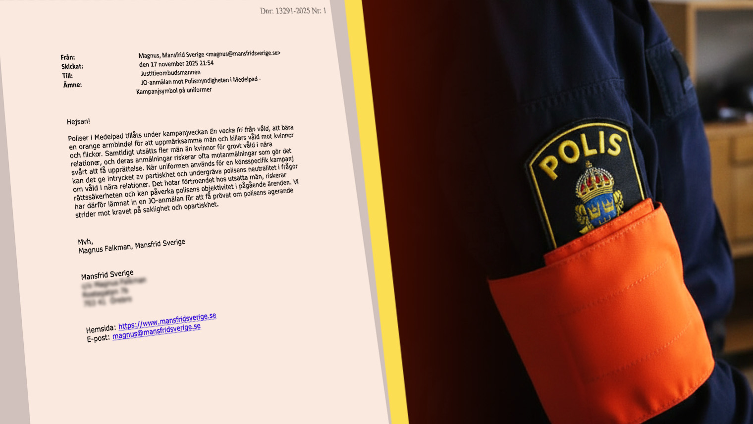 När Polisen i Medelpad under kampanjveckan En vecka fri från våld bar orange armbindlar för att uppmärksamma mäns våld mot kvinnor väckte det starka reaktioner. Mansfrid Sverige har nu anmält agerandet till JO och menar att polisen medvetet tar ställning i en könskonflikt. Enligt organisationen riskerar symboliken att skada förtroendet hos våldsutsatta män, som redan har svårt att få gehör hos myndigheterna – och att bryta mot den neutralitet som polisuniformen enligt både lag och praxis ska representera.