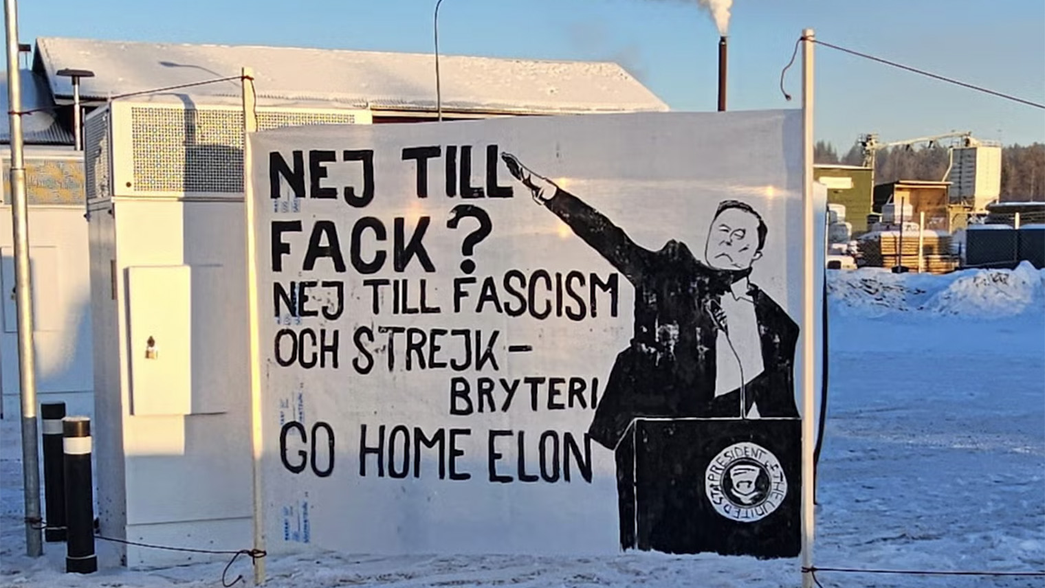 Det politiska budskapet på platsen knyter an till den långdragna svenska Tesla-konflikten, där stridsåtgärder och blockader iscensatts av LO-anslutna fackförbundet IF Metall. Samtidigt finns tecken på att konflikten inte är okomplicerad ens internt i fackleden.