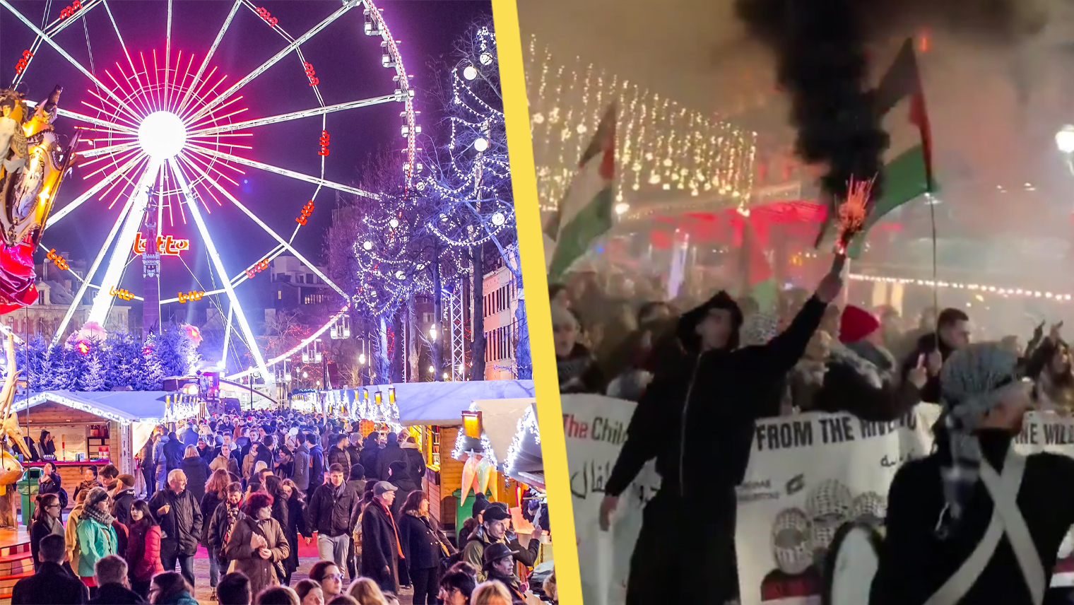 ”Julmarknaden i Bryssel håller på att förvandlas till ett islamiskt helvete”, kommenterar Geert Wilders på sociala medier med en video på den pro-palestinska mobben som protesterade med facklor och trummor bland stugorna och stånden under juldekorationerna.