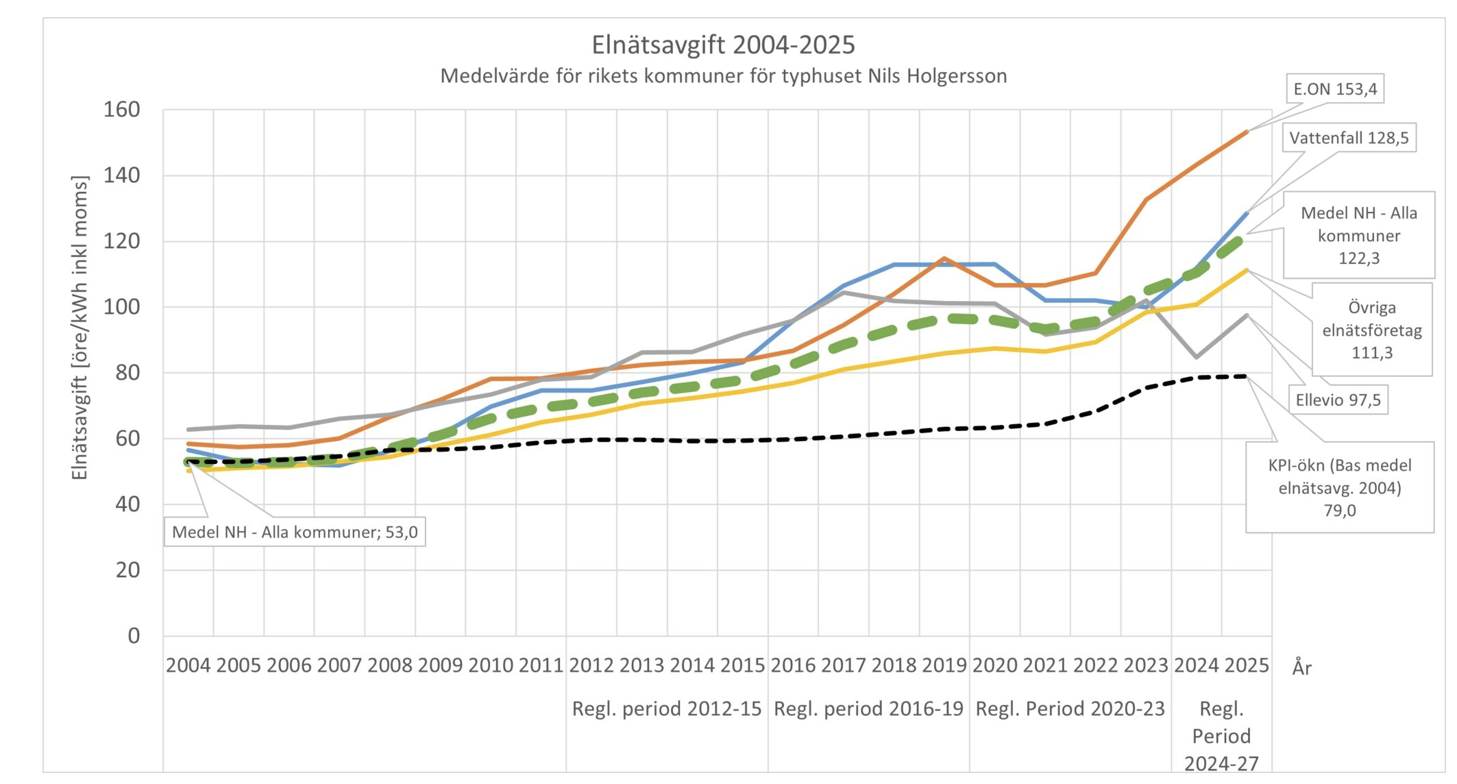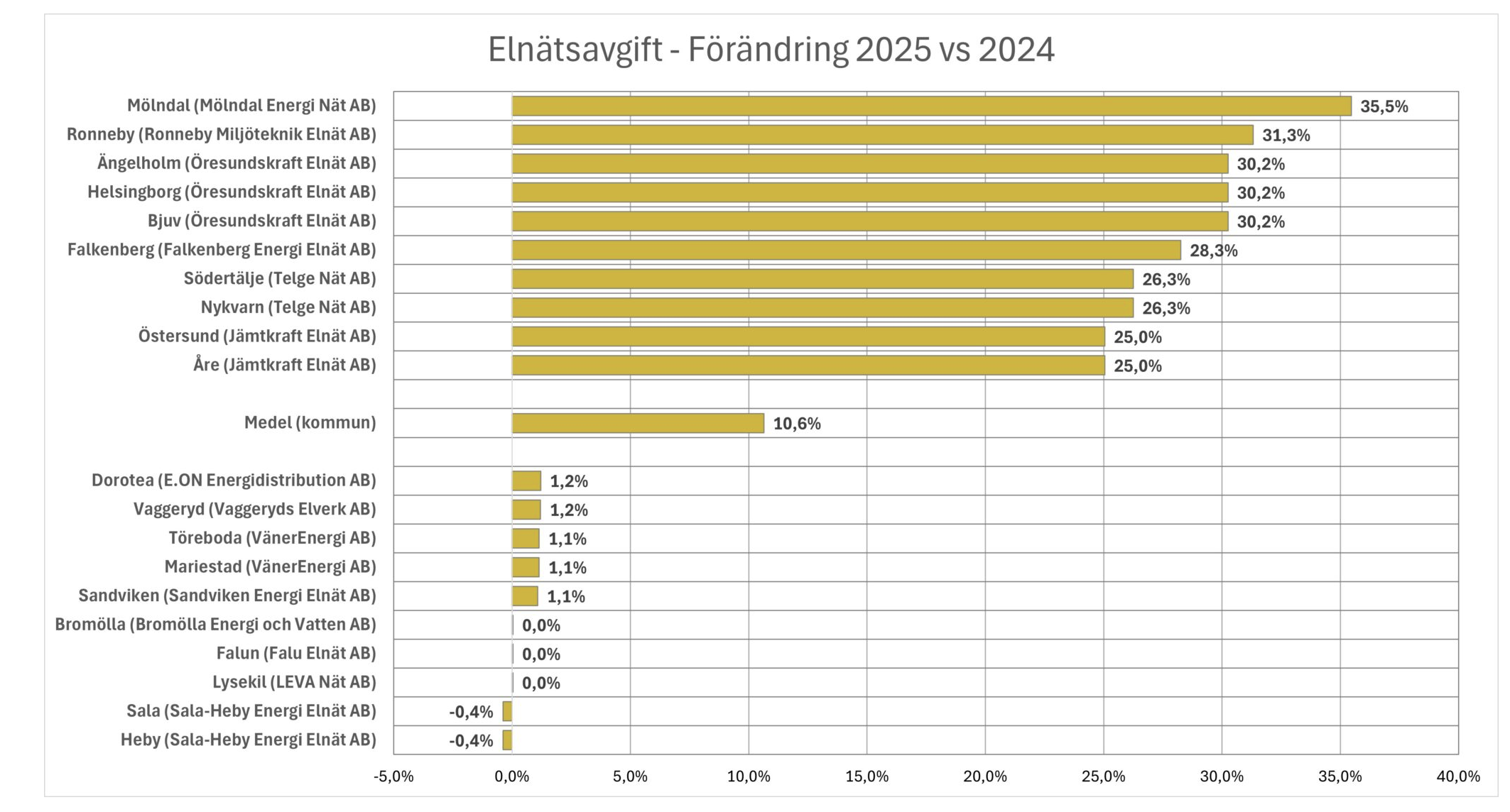 Enligt Nils Holgersson-gruppens kartläggning ökade elnätavgifterna med i genomsnitt 10,6 procent mellan 2024 och 2025. Det är den största höjningen sedan mätningarna började 1996. Det tidigare rekordet sattes så sent som 2023, då genomsnittet låg på 9,6 procent.
