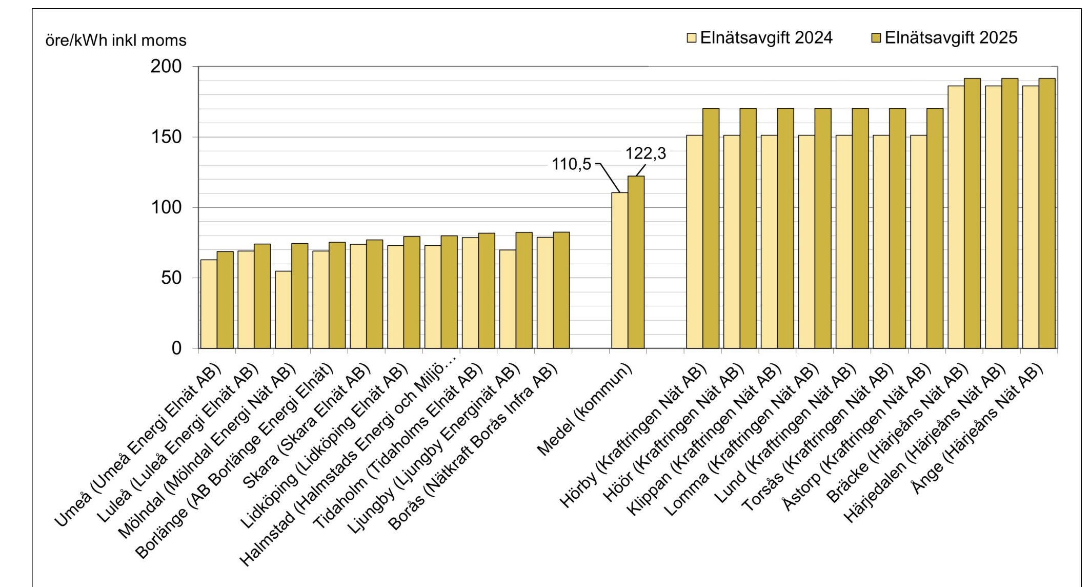 För ett genomsnittligt hushåll i lägenhet innebär årets höjningar en ökning på cirka 11 procent – den största sedan mätningarna inleddes för tre decennier sedan. Som jämförelse låg fjolårets genomsnittliga höjning på drygt 5 procent. Fem elnätsbolag höjer nu sina avgifter med omkring 30 procent.