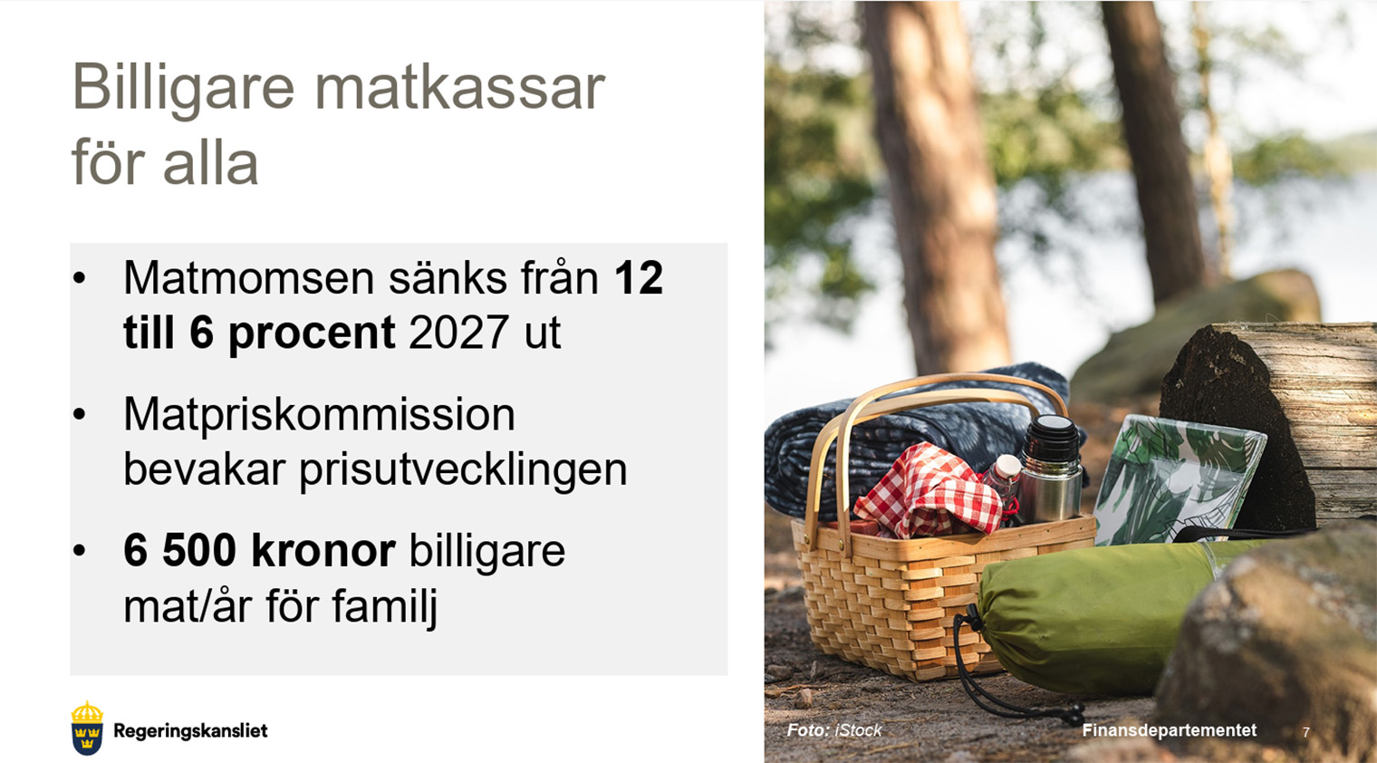 En av de mest omfattande åtgärderna är sänkningen av momsen på livsmedel från 12 till 6 procent. Enligt regeringen innebär det en märkbar lättnad för många hushåll.