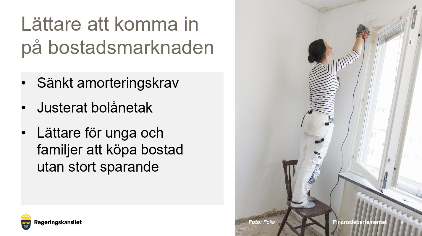 Samtidigt införs förändringar i bolånereglerna med syftet att göra det enklare att köpa bostad, särskilt för unga och familjer. Amorteringskravet sänks från 3 till 2 procent och kontantinsatsen minskas från 15 till 10 procent.
