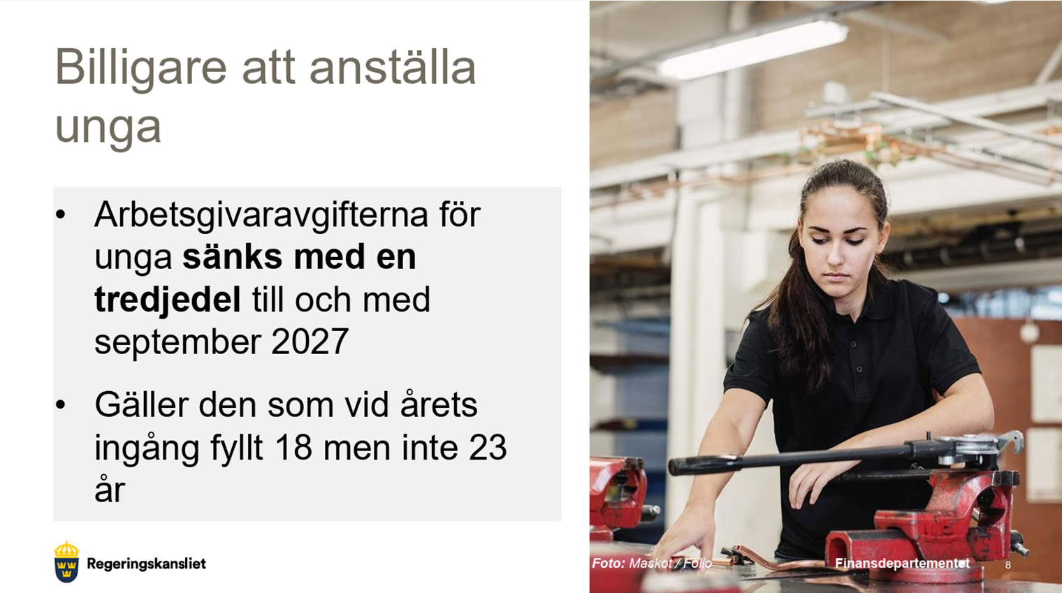 En tredje central åtgärd är att det blir billigare att anställa unga – något regeringen hoppas ska stärka arbetsmarknaden och ge fler en första fot in i arbetslivet.