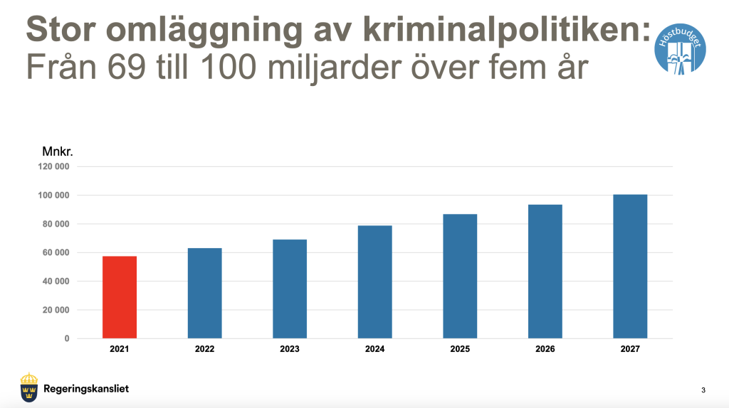 Det framgick även vid pressträffen att rättsväsendets budget kommer att växa från 69 miljarder kronor år 2023 till 100 miljarder år 2027.