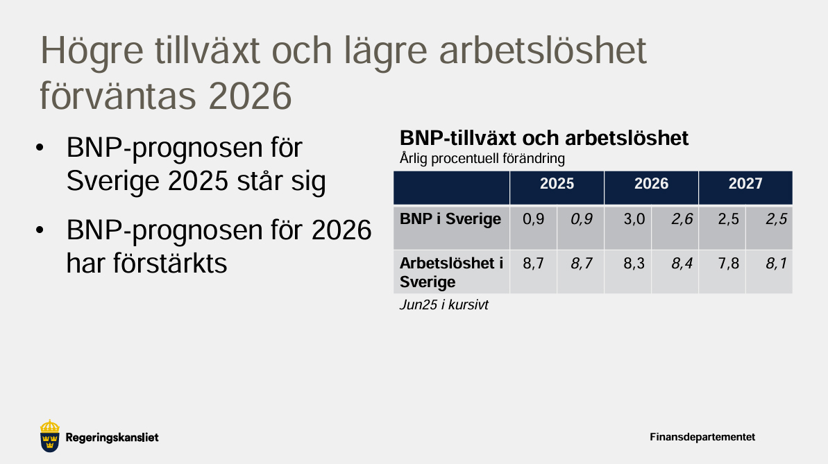 Regeringen bedömer dock att återhämtningen kommer i gång under hösten och att tillväxten tar fart på allvar 2026. Den nya prognosen från finansdepartementet pekar mot en BNP-ökning på 3,0 procent nästa år – upp från 2,6 procent i juniprognosen. För 2025 ligger prognosen kvar på 0,9 procent.