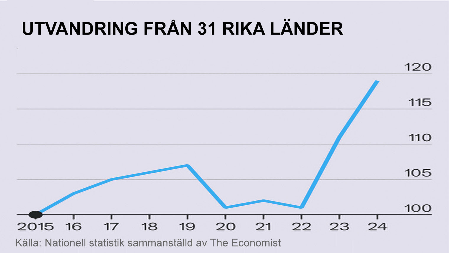 The Economist beskriver i en analys hur omkring fyra miljoner människor emigrerade från ett trettiotal västländer under 2024. Det är ungefär 20 procent fler än före pandemin. Ökningen syns i många länder – Sverige, Kanada, Nya Zeeland och Italien har alla noterat kraftiga uppgångar i antalet som flyttar ut.