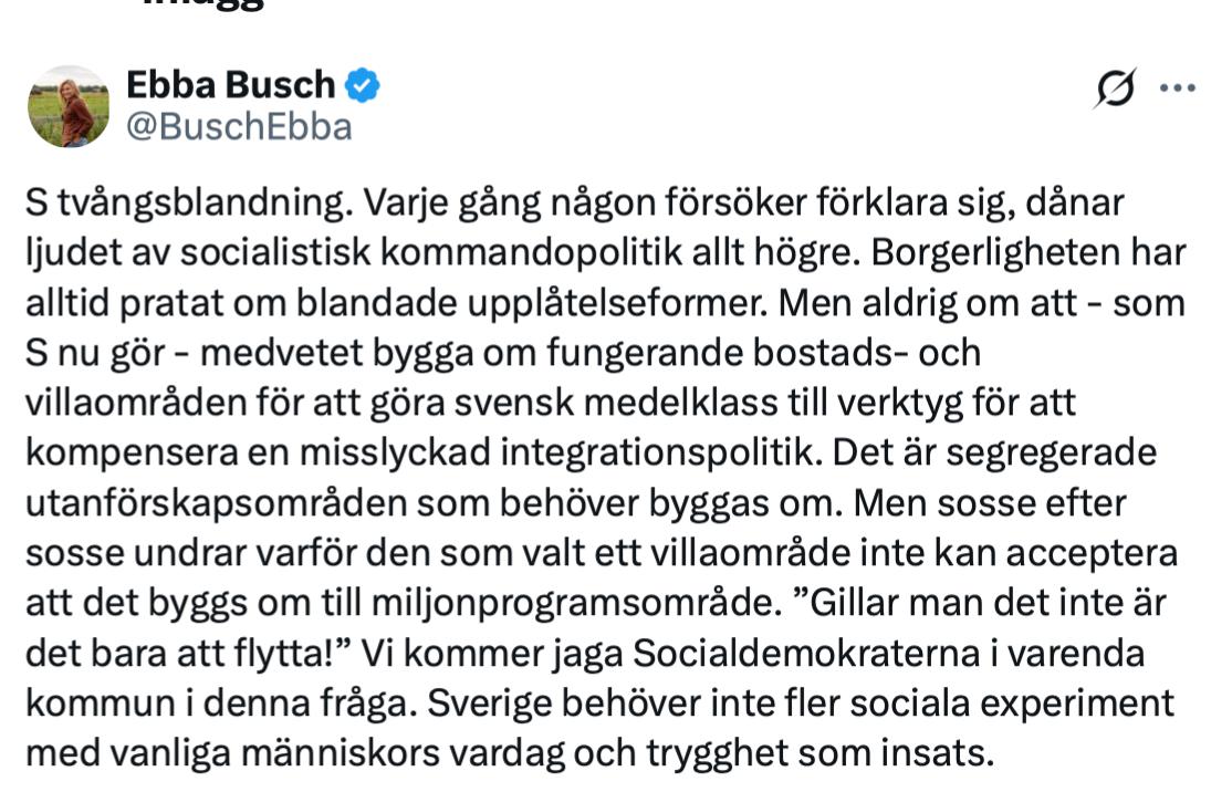 Även Kristdemokraternas partiledare Ebba Busch uttrycker sig starkt kritiskt om Socialdemokraternas nya aggressiva integrationsdrivna bostadspolitik. I ett inlägg i sociala medier kritiserar hon bland annat att hur S nu vill göra svensk medelklass i fungerande villaområden till ”verktyg för att kompensera en misslyckad integrationspolitik.