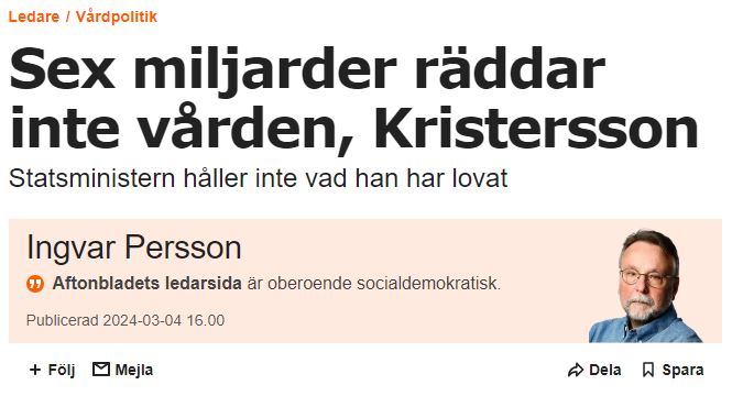 I en ledare i Aftonbladet riktar man sig till regeringen och statsministern med rubriken ”Sex miljarder räddar inte vården, Kristersson”. Alltså är det just regeringen och statsministern man menar ansvarar för situationen.